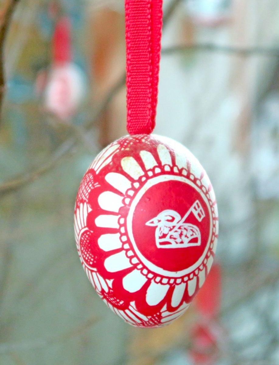 Zu Ostern finden sich in vielen Häusern Sträuße voll grünender Zweige. An ihnen hängen bunte Ostereier. So ein kunstvoll verziertes Ei zeigt das Bild auf dieser Karte. Wir erkennen das frühchristliche Motiv des Osterlamms, das die Siegesfahne trägt. Das wehrlose, unschuldige Lamm ist ein altes Symbol für Jesus.